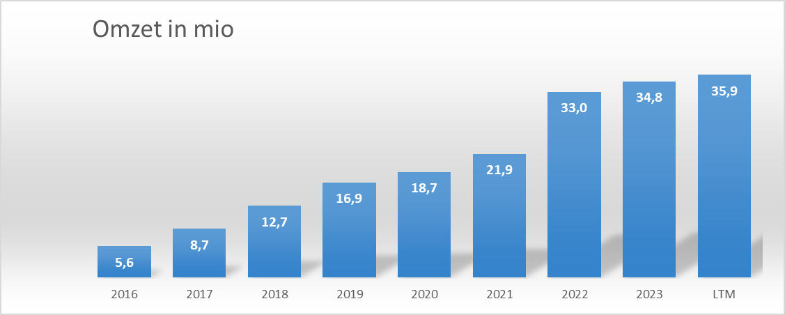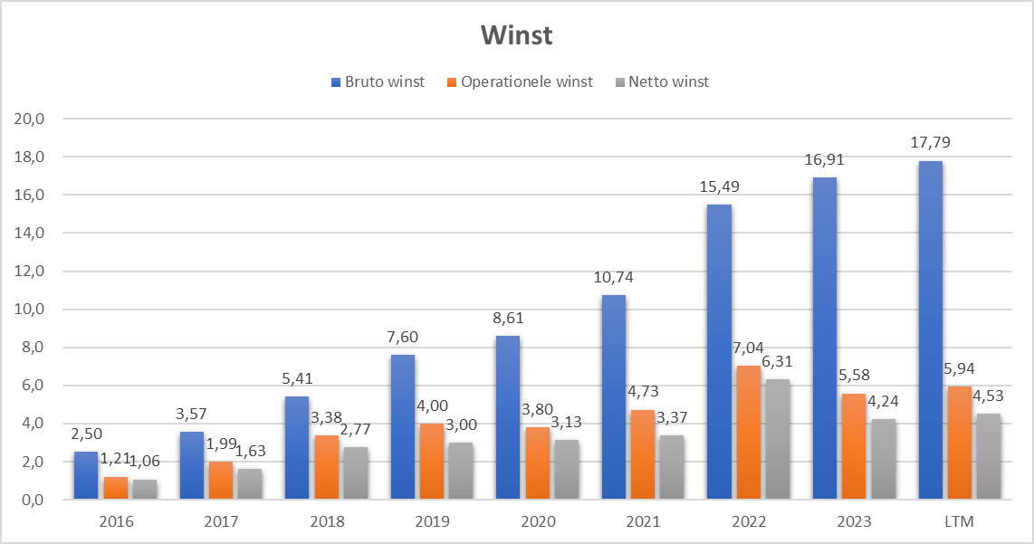 De stijgende brutomarge is uiteraard vooral een gevolg van efficiënter werken door de grotere omvang. De knik in 2022 vinden we terug bij de duurdere grondstoffen en transport.