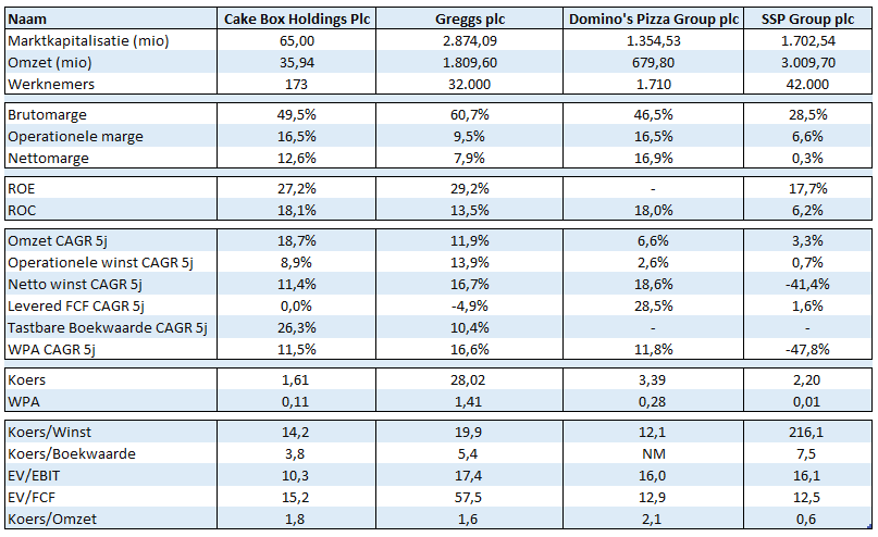 Een echt vergelijk met concurrentie kunnen we voor Cake Box niet maken. De namen die ik tegenkwam die directe concurrentie vormen, zoals The Little Cake Cottage, The Cake Shop, Cakes By Robin en Heaven is a Cupcake, zijn niet beursgenoteerd. Dit zijn allemaal winkels en geen keten of franchisenetwerk. Dit zijn ook de wat chiquere producten, althans dat is de indruk die ik krijg van mijn online onderzoek.