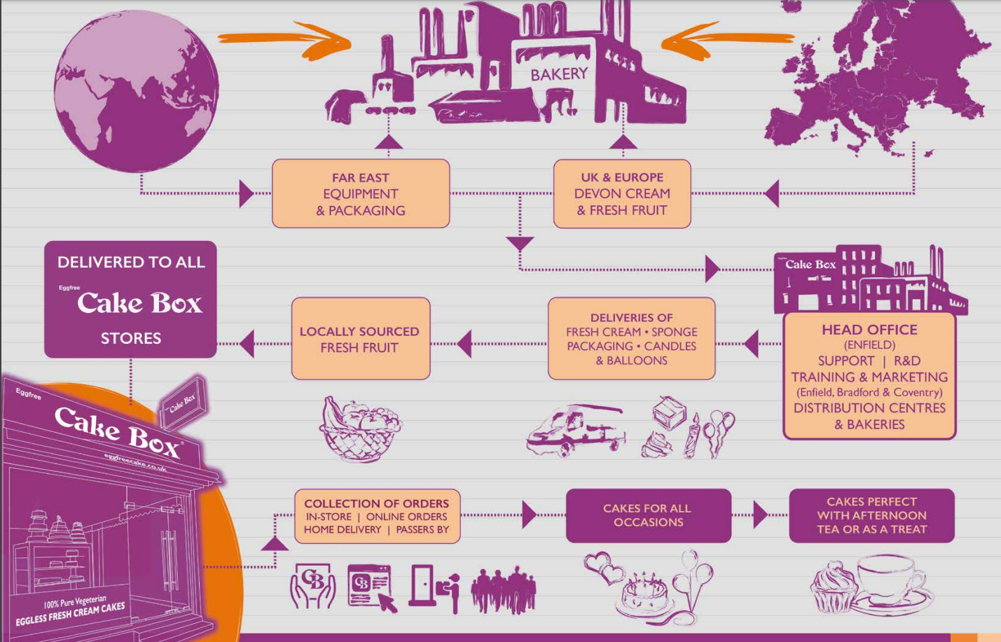 Cake Box is ook een kapitaallicht bedrijf. Buiten de bakkerijen en magazijnen zitten de kosten voor de winkels bij de franchisees. Het deel schulden betreft voornamelijk de leasing van het magazijn in Enfield; de andere twee locaties zijn in eigen bezit.