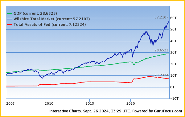 Een tijdlang werd gezegd dat de grotere stijging van de marktwaarde van de beurs te danken was aan de geldinjecties en de FED, de Amerikaanse centrale bank. Maar nu zien we die rode lijn dalen, terwijl de blauwe lijn ongekende hoogtes bereikt.