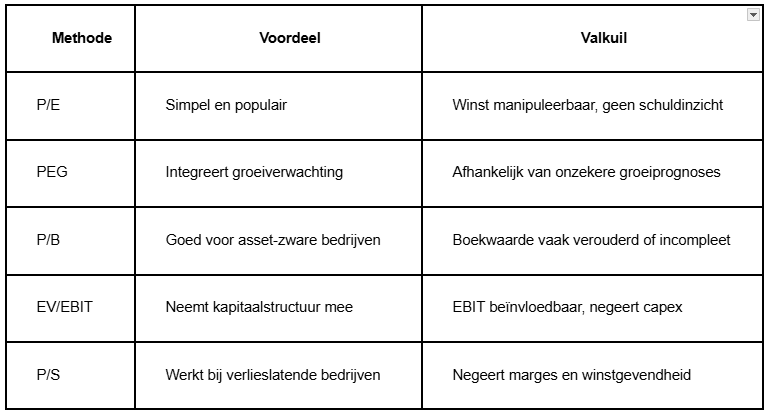 → Relatieve waarderingen zeggen niets over cashflow, schulden, of kwaliteit. - Wees kritisch bij hoge multiples