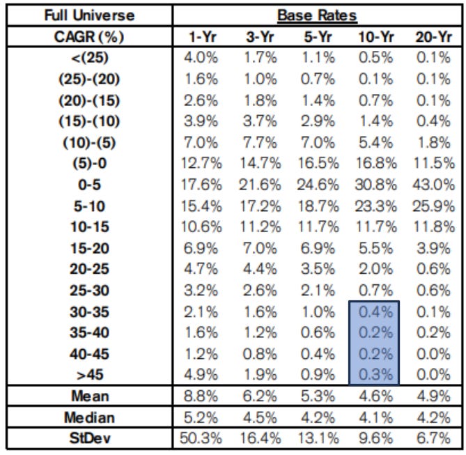 Laten we eens kijken of dit realistisch is. Als we kijken naar de baserates van Mauboussin, dan zien we het volgende: