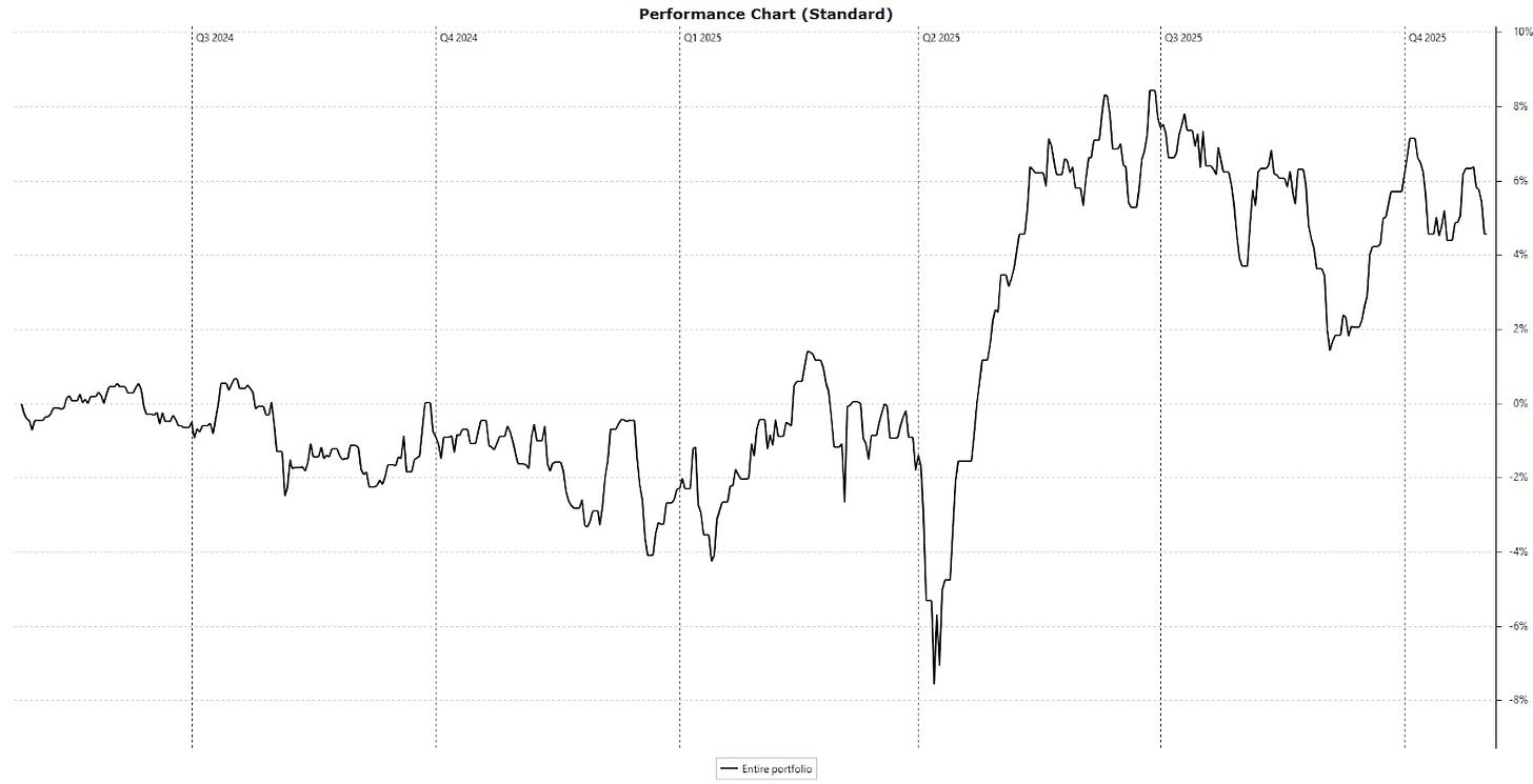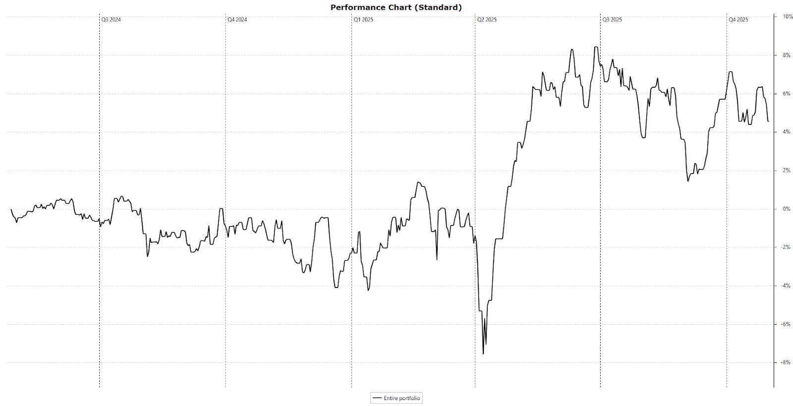 In oktober moest de portefeuille 1,1% inleveren, waardoor het jaarresultaat eind oktober op 7,5% uitkwam. Wat mij vooral opvalt, is dat de portefeuille zeer onafhankelijk beweegt; er is weinig gelijkenis met de indexen. Dat is op lange termijn positief, maar in een periode waarin de S&P 500 nieuwe hoogtes blijft verkennen, is het minder prettig.
