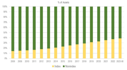 Op deze afbeelding zien we dat ondertussen indexbeleggen goed is voor 39% van alle beleggingen wereldwijd.