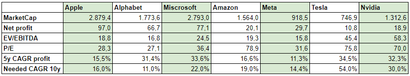 Voor wie geïnteresseerd is, heb ik een tabel opgesteld met de marktkapitalisatie, nettowinst, EV/EBITDA, koers-winstverhouding, samengestelde winstgroei van de afgelopen 5 jaar en de groei die nodig is in de komende 10 jaar om de beurskoers te rechtvaardigen.