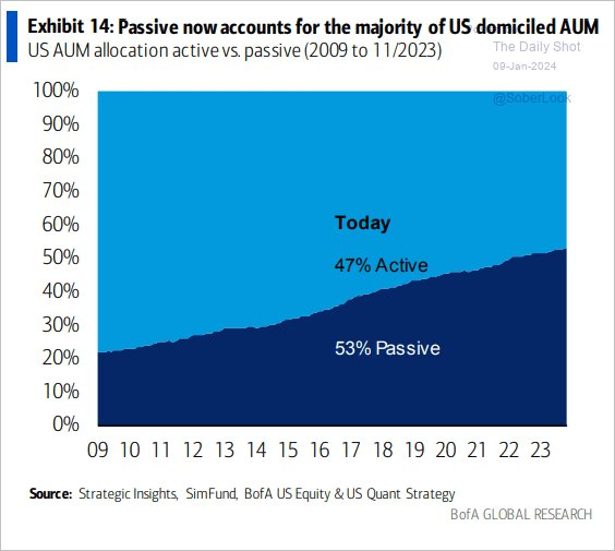 In Amerika is het zelfs nog straffer, daar is volgens Bank of America al 53% van het vermogen passief belegd.