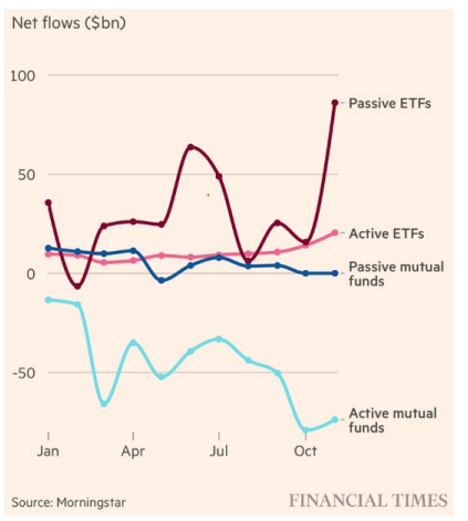 In de afbeelding hierboven zien we dat het geld dat naar passieve ETF’s gaat rechtstreeks uit actief beheerde fondsen vloeit.