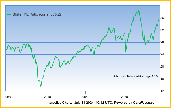 Door de goede resultaten die werden gepubliceerd door de grote techbedrijven, daalde de Shiller PE iets, maar deze blijft nog steeds op een historisch hoog niveau staan van 35,2, terwijl het gemiddelde 17,5 is.