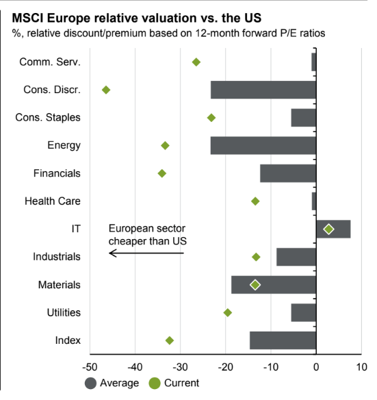 De relatieve waardering van sectoren in Europa ten opzichte van hun Amerikaanse tegenhangers wijkt zeer sterk af van de historische cijfers, met IT en Materials als enige uitzonderingen. Met andere woorden, voor Amerikaanse aandelen wordt voor dezelfde winst een veel grotere premie betaald dan gebruikelijk, of de discount voor dezelfde winst van Europese bedrijven is groter. In combinatie met de eerste grafiek is het waarschijnlijk het eerste..