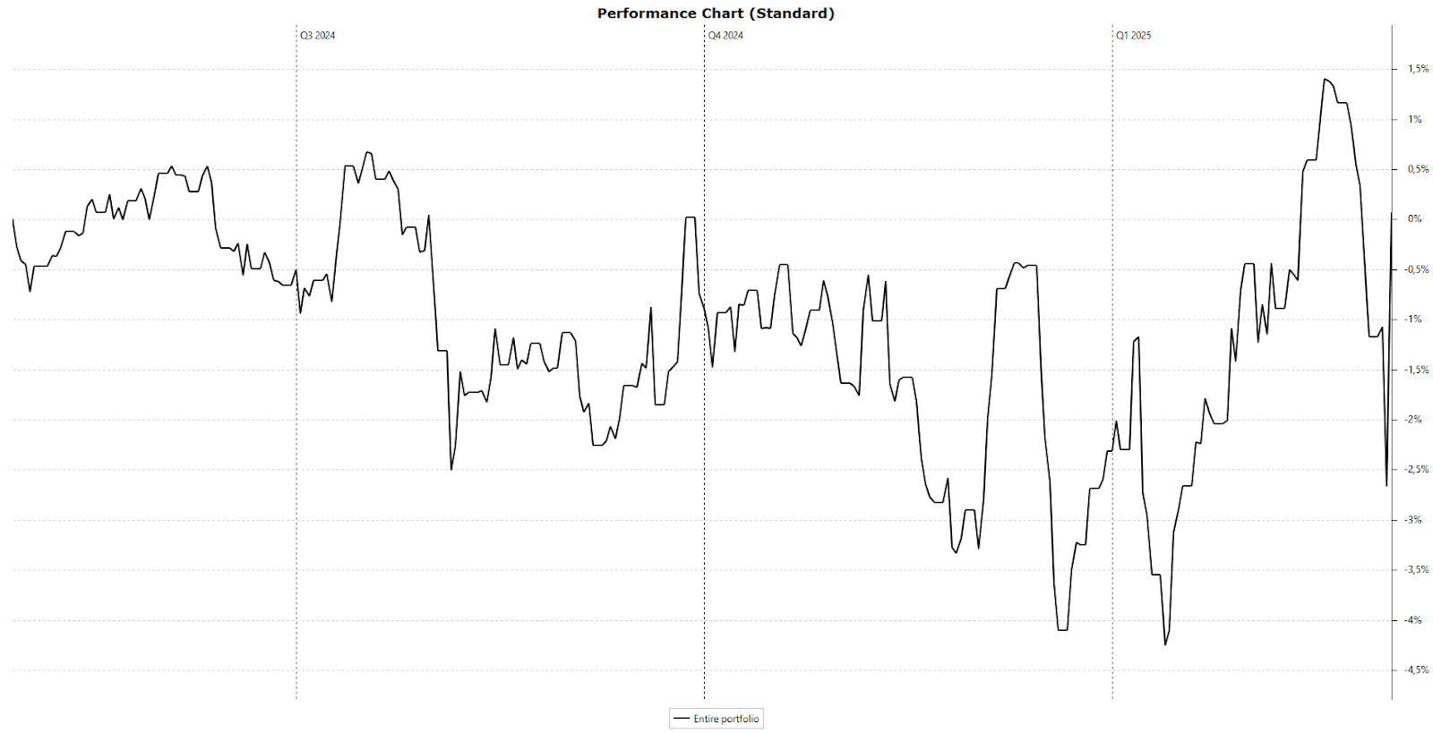 Als een totale portefeuille, met een cashbuffer van 33%, al zulke sprongen maakt, weet je dat de onderliggende aandelen nog heviger schommelen. Stellantis, bijvoorbeeld, bewoog in drie dagen tijd tussen €12,62 en €10,86—een verschil van 16% tussen de hoogste en laagste koers in de eerste helft van de week, puur door Trumps uitspraken. Het lag niet aan zwakke cijfers; die klap was een week eerder al gekomen en verwerkt.