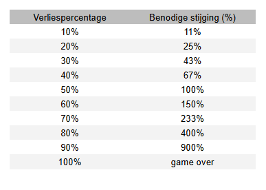 Voor de volledigheid geef ik even de tabel mee van welk percentage je aandeel moet stijgen na een verlies.