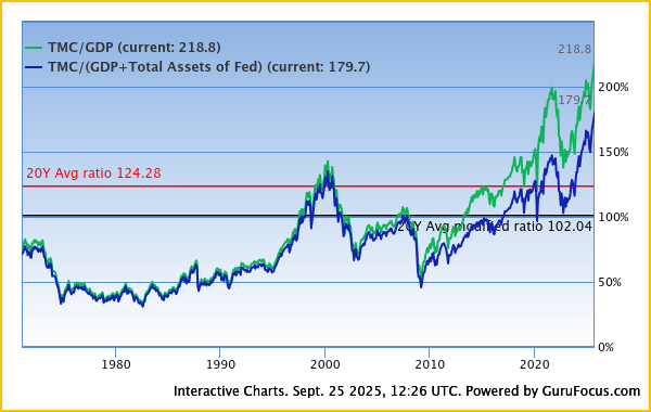 Bovenstaand heb ik het nu voor de maximale termijn eruit gehaald dat Gurufocus toelaat. Hierop kan je zien dat we gigantisch boven het twintigjarige gemiddelde liggen, maar dat ook dat twintigjarige gemiddelde al 20% boven het aangepaste gemiddelde ligt.