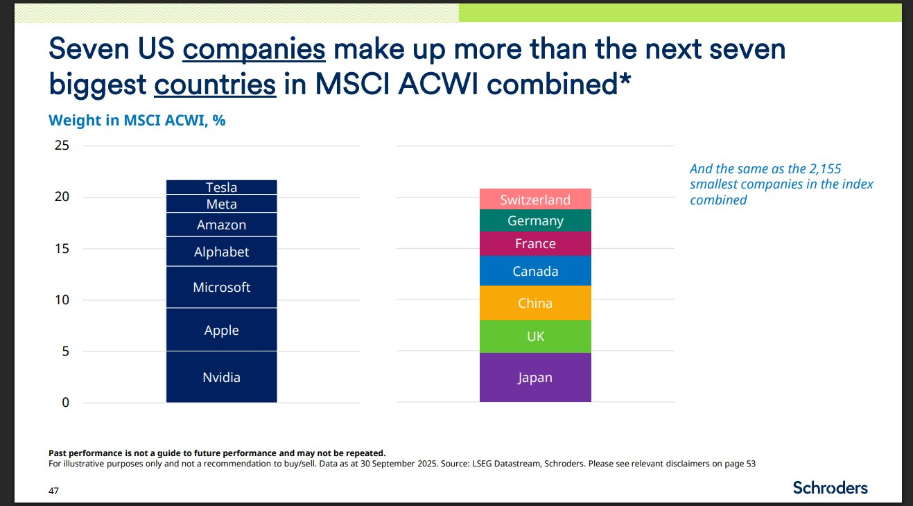 In de MSCI ACWI-wereldindex hebben de zeven grote Amerikaanse aandelen een groter gewicht dan de volgende zeven grootste landen. Zeker het gewicht van Nvidia is enorm, met zo’n 5% van een wereldindex.